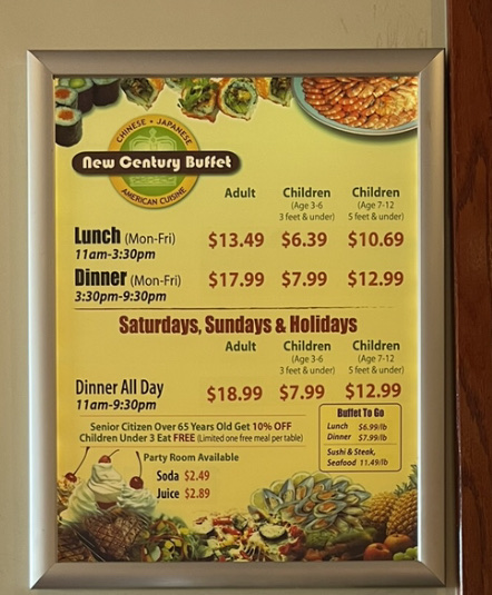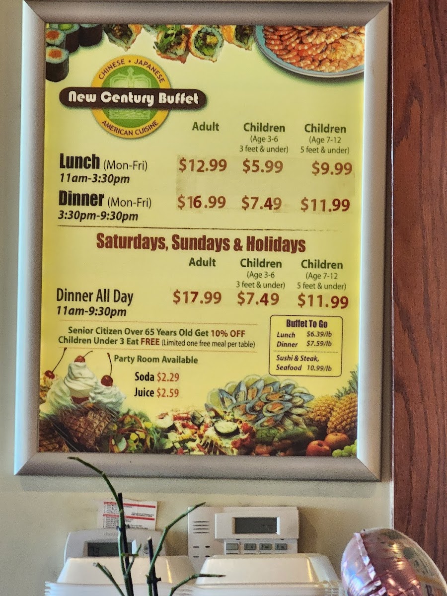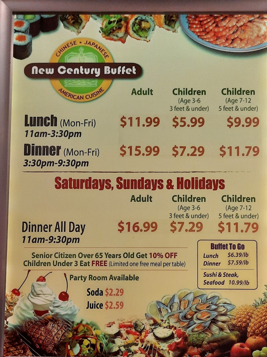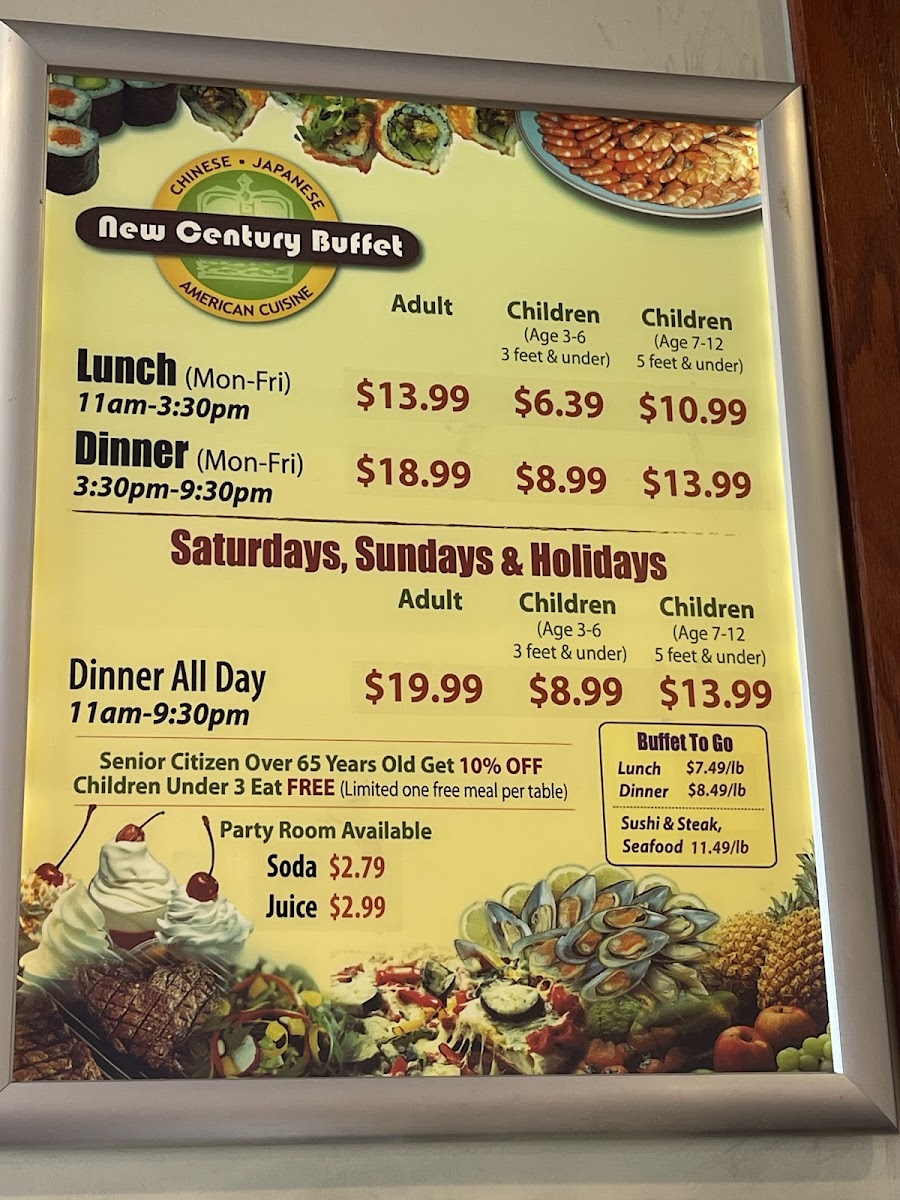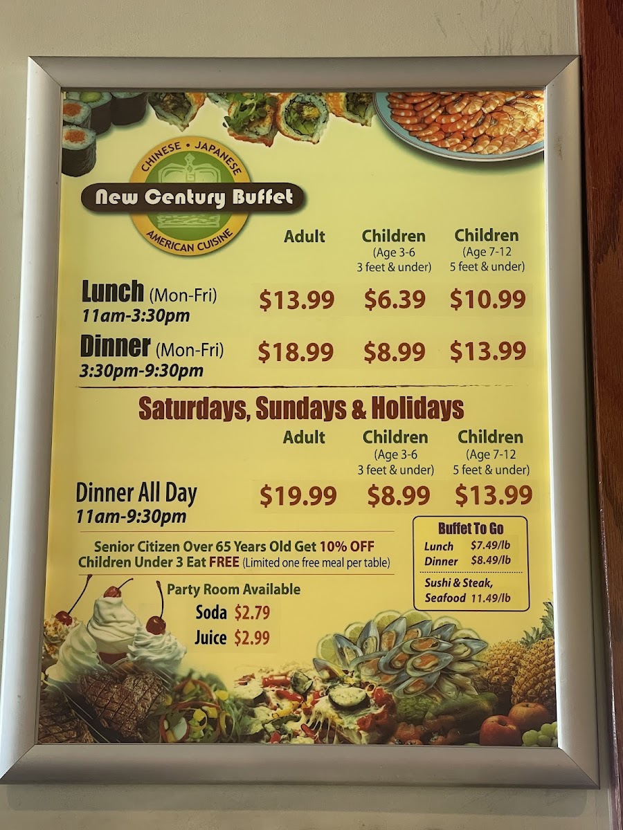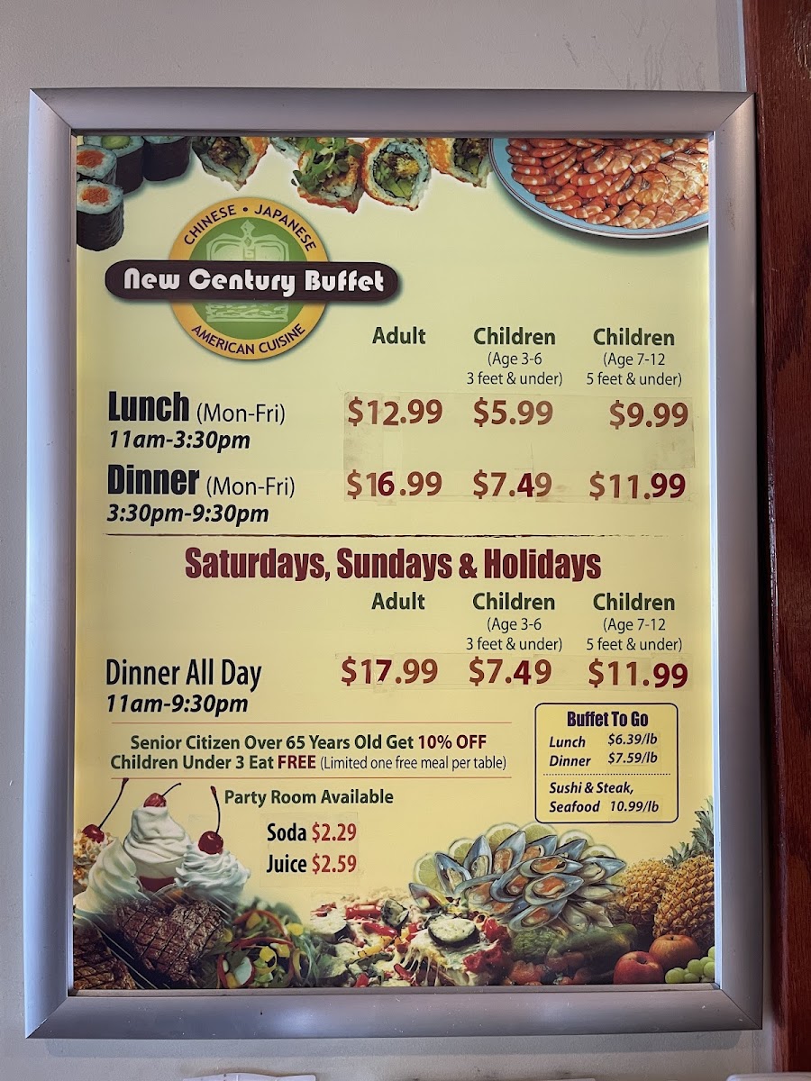 Welcome to the New Century Buffet, a buffet restaurant located conveniently at 868 Jackman St, El Cajon, CA. With an unbeatable lunch buffet starting at just $9.79 and a dinner option for $12.99, it’s no surprise that locals rave about the value. Diners can enjoy an impressive array of freshly made dishes—from flavorful Chinese fare to a refreshing sushi bar. Customer reviews highlight the warm, attentive service and the ongoing replenishment of food, ensuring a consistently delightful experience. Many guests have praised favorites like hot and sour soup and orange chicken, emphasizing that everything is both tasty and hot. The buffet’s atmosphere strikes a balance between casual and welcoming, making it perfect for family outings, including special occasions like Mother’s Day. Whether you’re indulging in soft serve ice cream or enjoying a hearty meal with friends, the New Century Buffet promises fantastic flavors at an exceptional price.